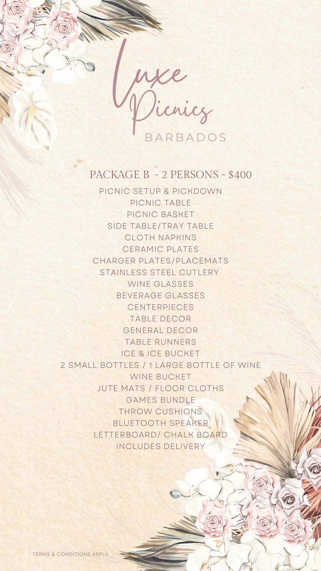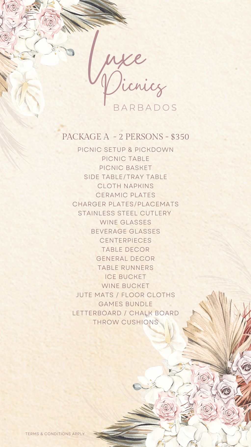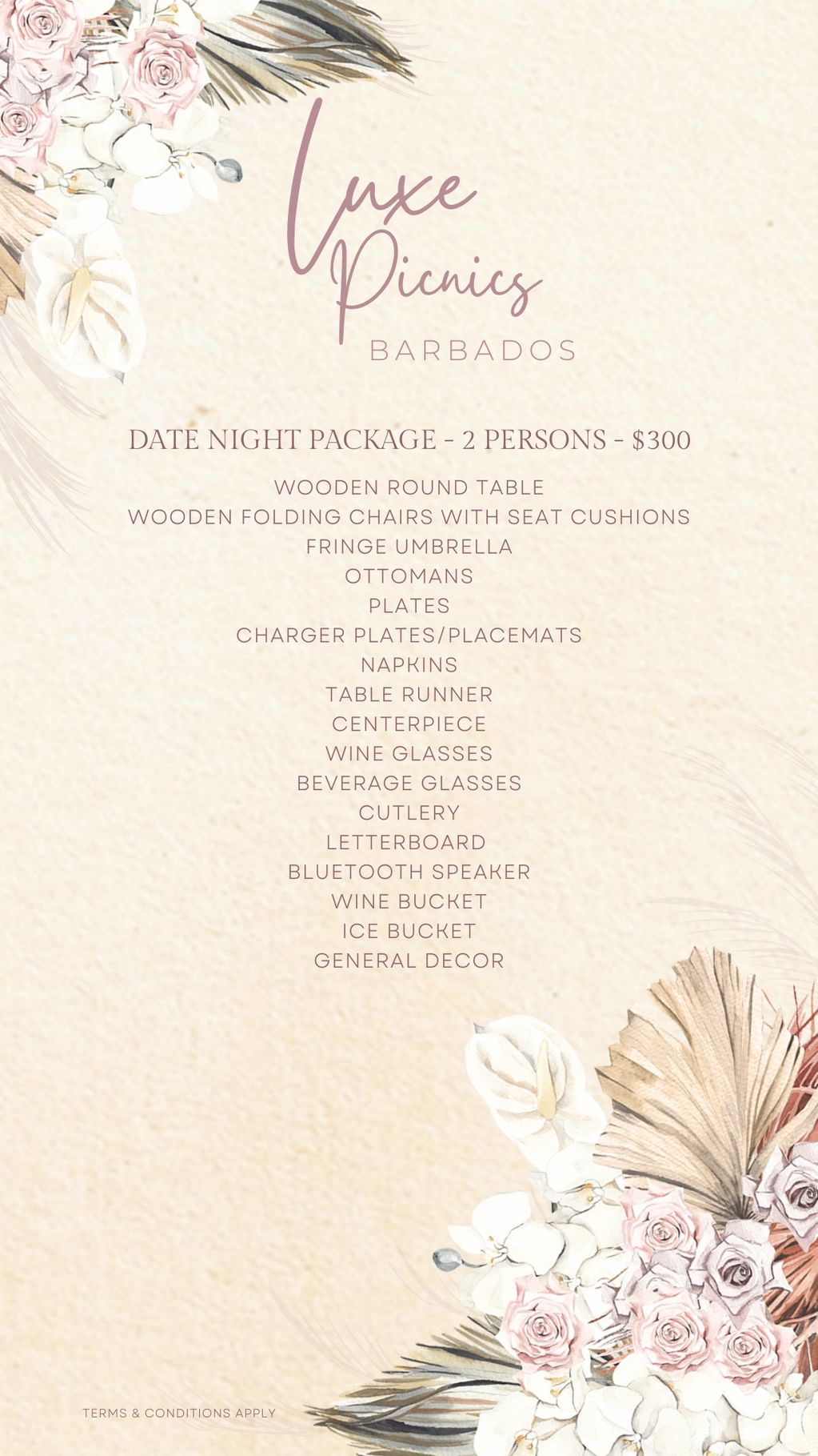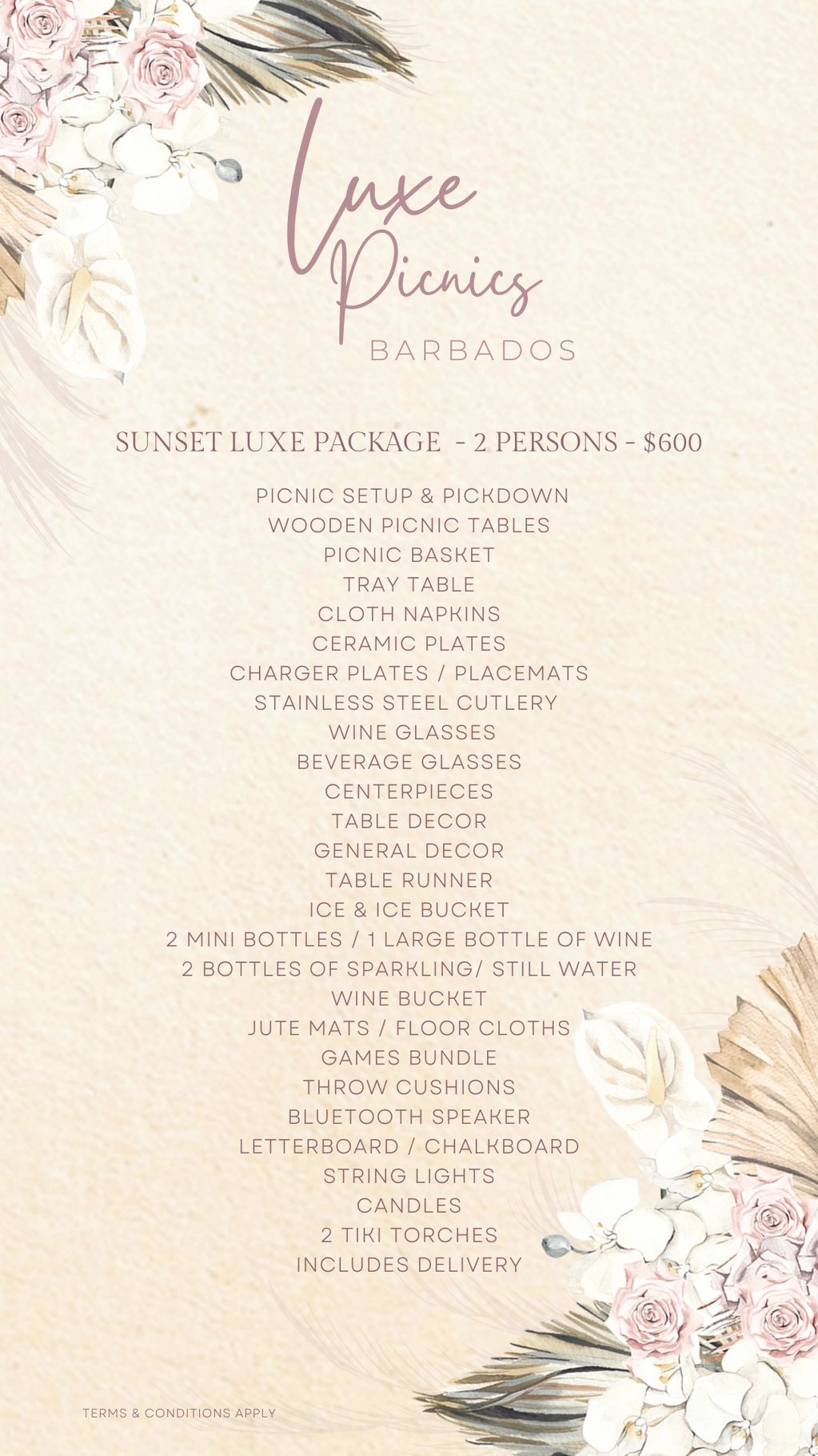 The links show a glimpse of each setup! This is just an example of how your special moment could look. Please note that layouts, colours, and specific décor pieces may vary as we make each setup unique. However, our commitment to quality, attention to detail, and signature Luxe Picnics Barbados design aesthetic will always remain the same. ✨